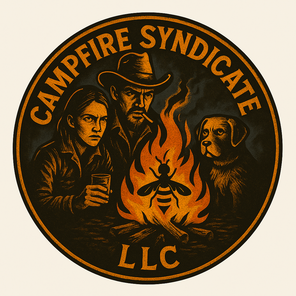 A rebel seal for those who burn the map and follow the smoke. Featuring the original Campfire Syndicate trio—Nicole, Marcel, and Drax the deranged—huddled ‘round a tactical blaze lit with fury, failure, and weaponized honey. The bee in the fire doesn’t sting. It detonates.