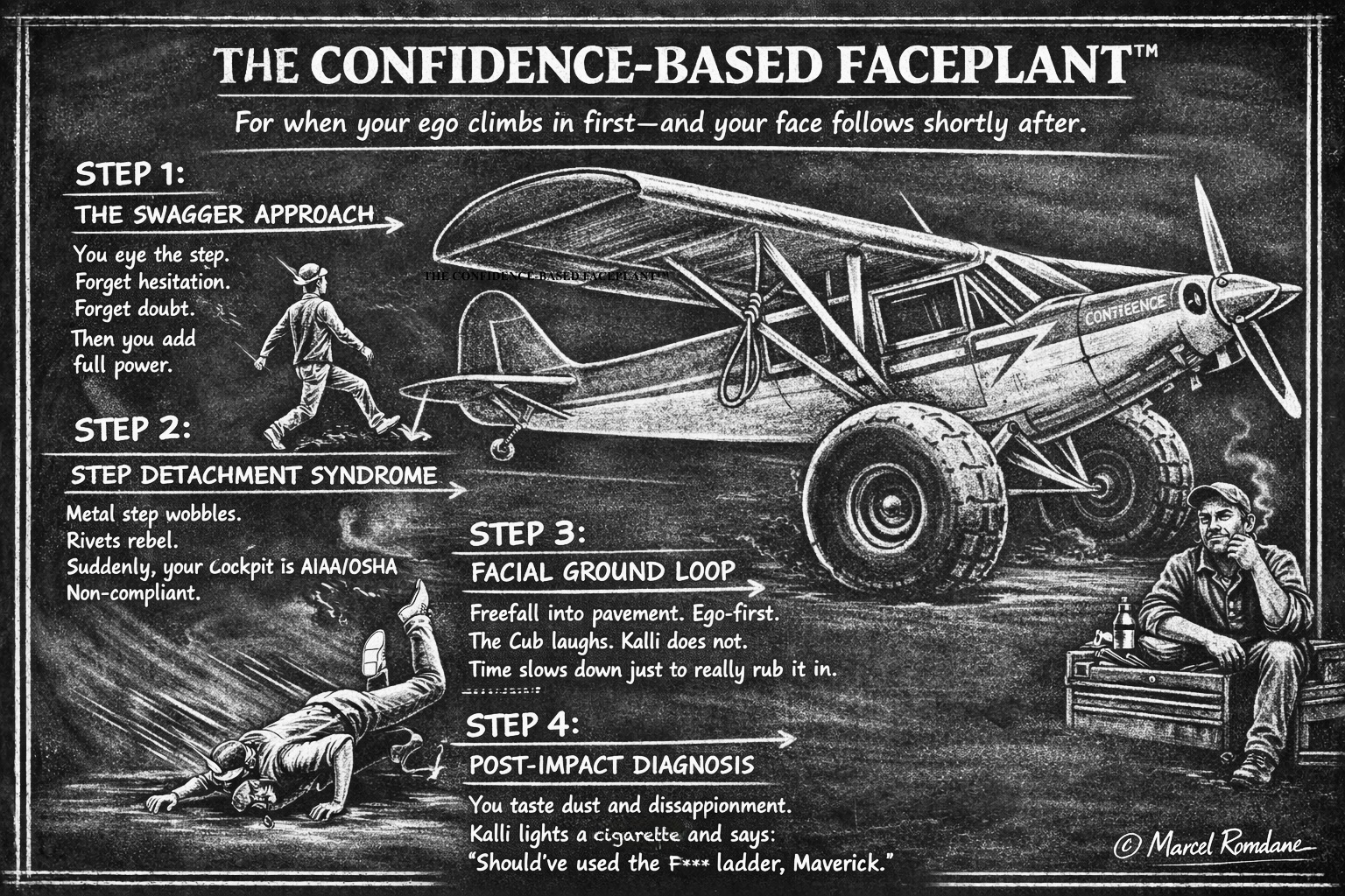 STEP 1: THE SWAGGER APPROACH You’re feeling good. Tail low, chest out, logbook full of legally-questionable time. You approach the aircraft like it owes you money. You eye the step like a mountain goat on Red Bull. No hesitation. No doubt. You launch your boot toward it like gravity’s on vacation. You are speed. You are grace. You are the protagonist of your own mental highlight reel—complete with slow-motion music and chest-thumping bravado.